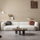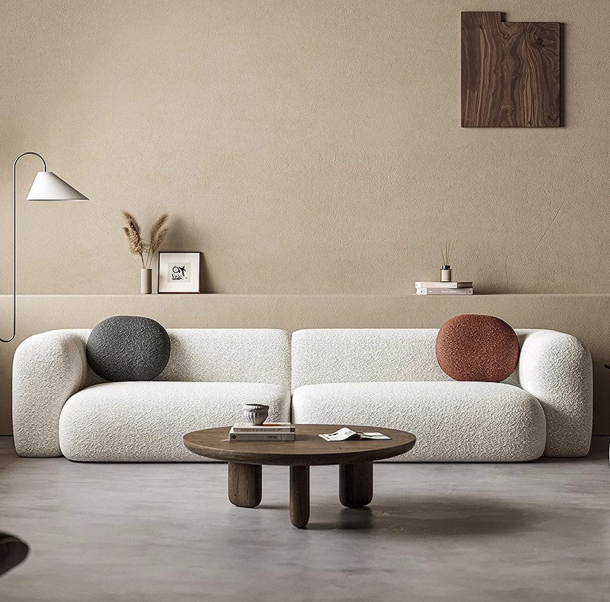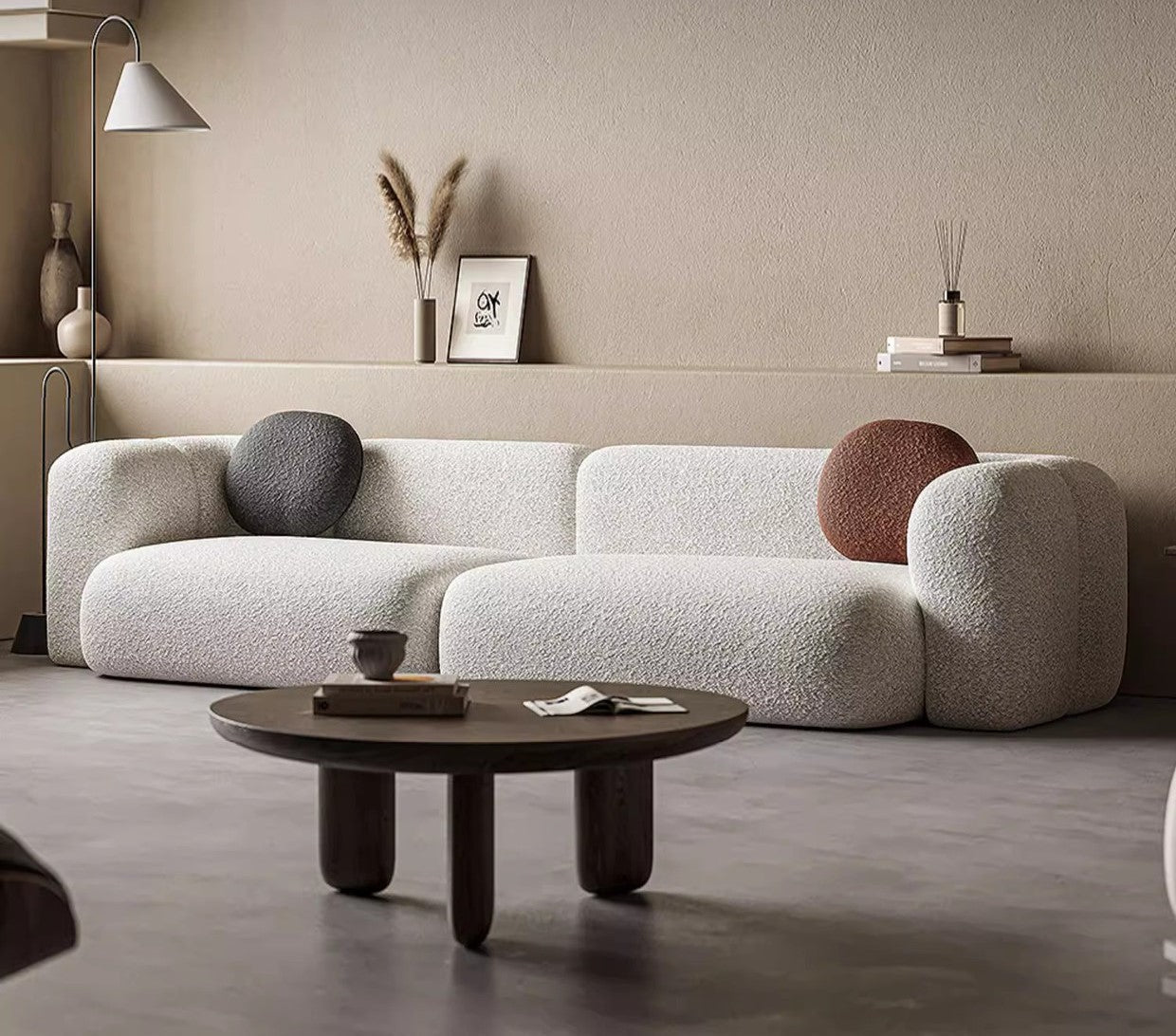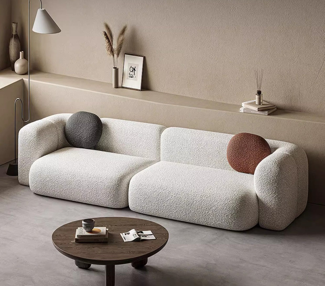 The sofa features a modern and elegant design, with soft, curved lines and rounded cushions that add a touch of comfort and elegance. The fabric feels soft and velvety, making it ideal for relaxing. The white color creates a sense of spaciousness and purity, making it suitable for a variety of decors.