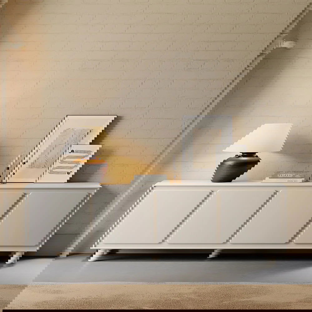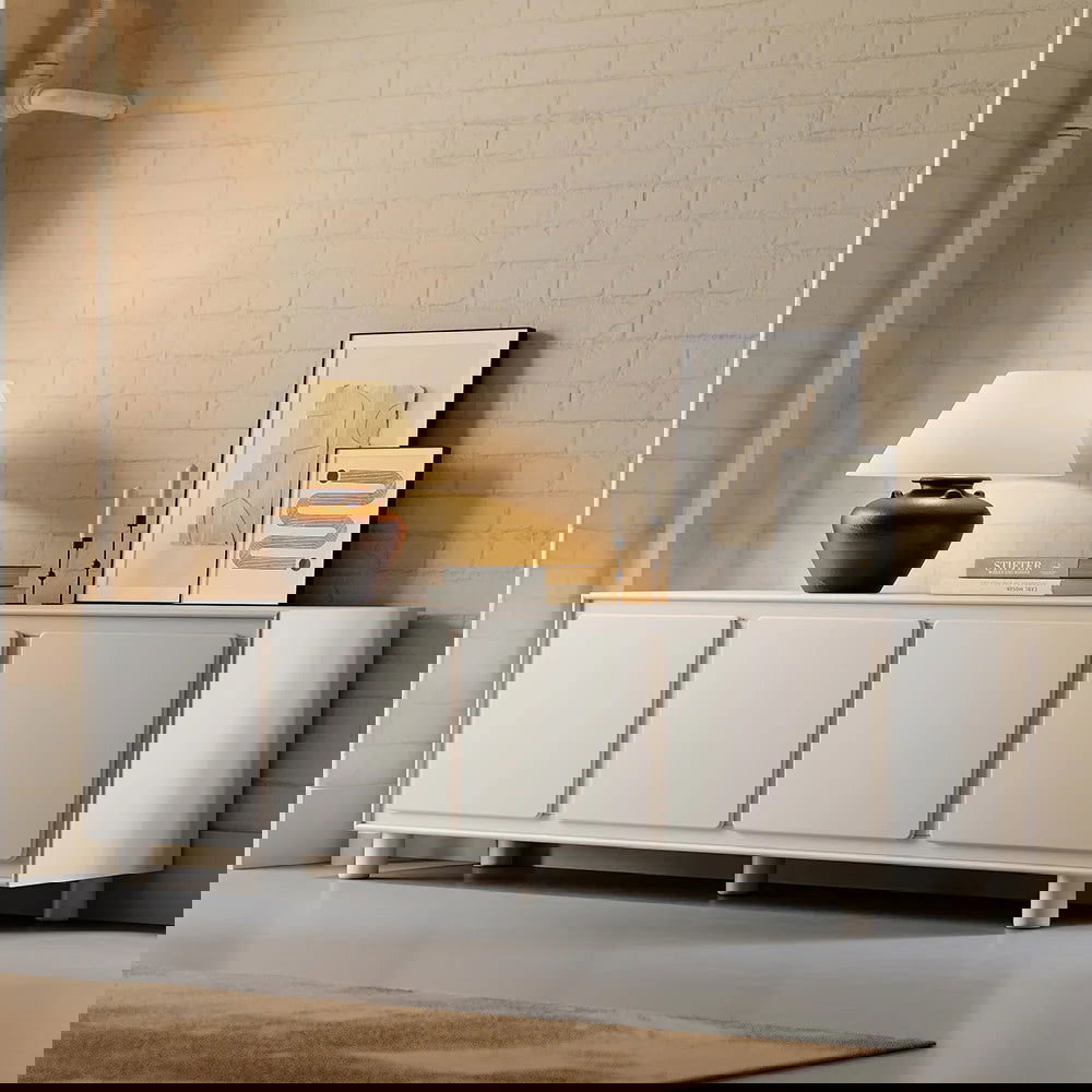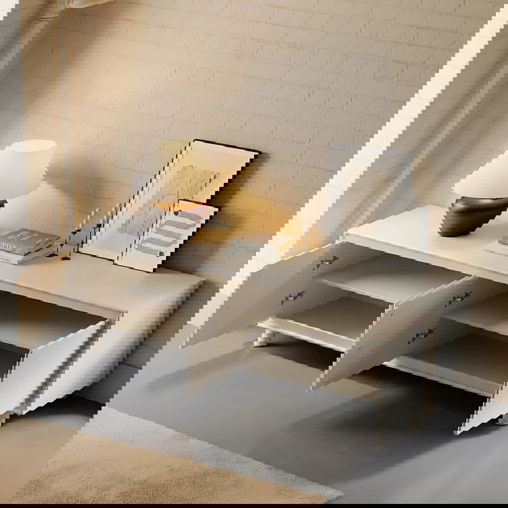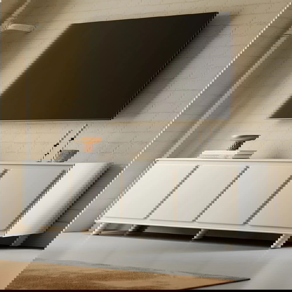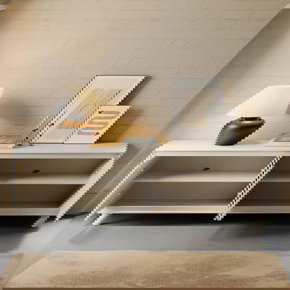 A luxurious TV table that combines elegance and practicality, made of the finest wood to add a warm touch to any decor. It features a streamlined design and contains multiple shelves and 3 drawers that provide ideal storage spaces for organizing devices and placing books and various collectibles in an elegant manner.