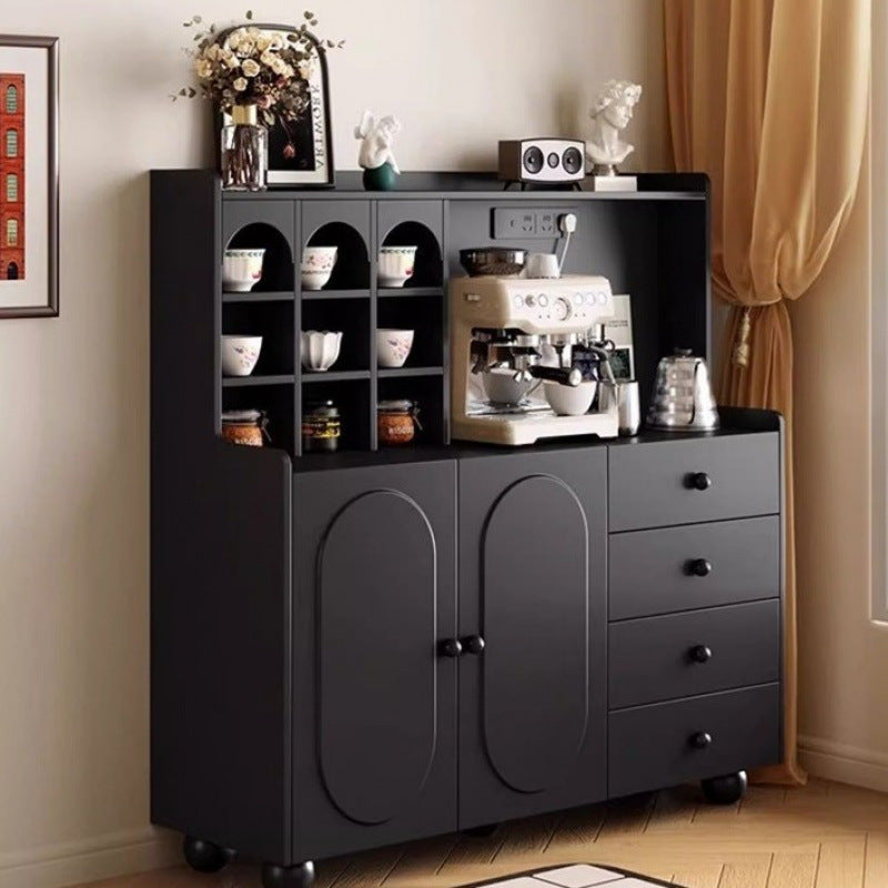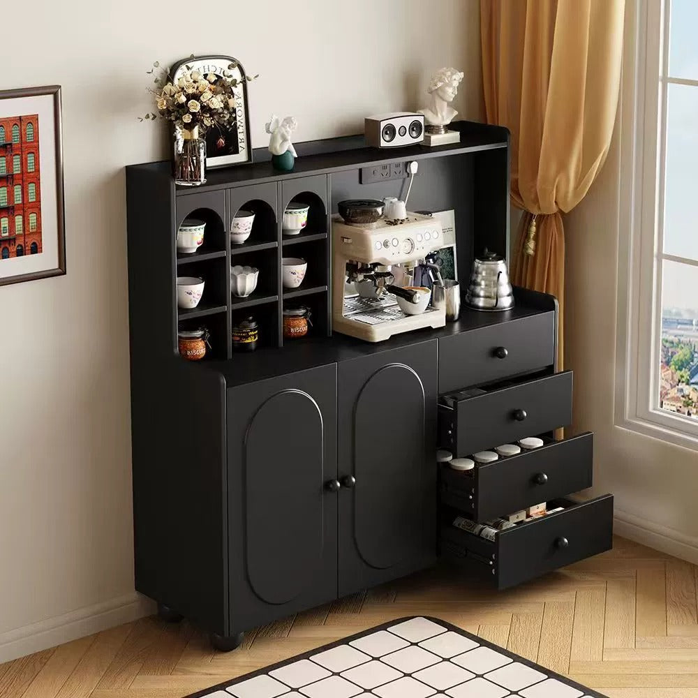 تميز في ركن الضيافة الخاص بك مع هذه الخزانة السوداء العصرية متعددة الوظائف التي تجمع بين الأناقة الراقية والعملية الفائقة. تتميز الخزانة بتصميم درامي باللون الأسود، مع أرجل كروية صغيرة تضفي عليها طابعاً مميزاً. الجزء العلوي المفتوح مصمم بذكاء ليضم رفاً منظماً مخصصاً لعرض الأكواب أو الديكورات، مع مساحة كافية لوضع آلة القهوة والمستلزمات. يوفر الجزء السفلي خيارات تخزين متنوعة أدراج عمودية واسعة للتخزين المخفي والمنظم، بالإضافة إلى بابين بتصميم بيضاوي يضفيان لمسة فنية ناعمة وجذابة. هذه الخزانة هي الحل الأمثل لخلق فاخر في منزلك، أو كبوفيه مركزي يجمع بين التخزين الوفير والعرض الأنيق.