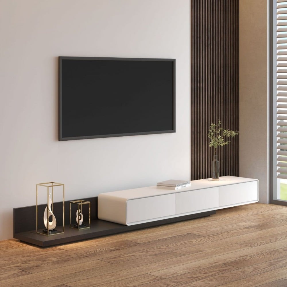 A TV table with a modern design that combines beauty and practicality. Made from high-quality materials, it features ample storage space thanks to its closed drawers and a large surface for placing decorations or electronic devices. The black and white color combination adds a sophisticated touch that complements various decor styles, with subtle lighting accents that enhance the room's luxury.