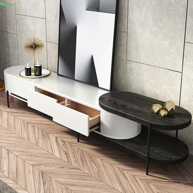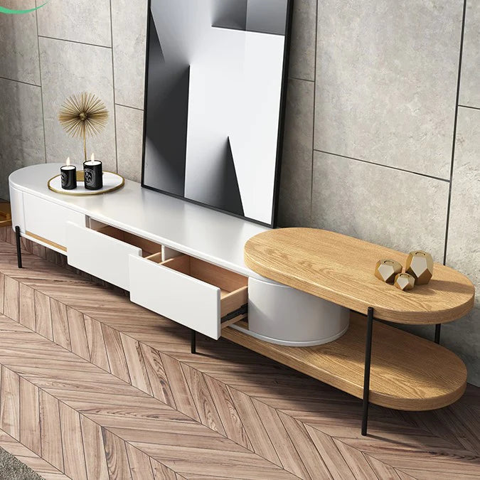 Elevate your living room decor with this stunning TV table. Designed with a modern touch, this oval-shaped unit features three drawers for ample storage space for books and other electronic accessories. Made from high-quality engineered wood, it boasts a sophisticated finish and a surface that can be easily wiped clean, making it the perfect choice for your home.