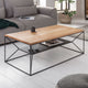 This coffee table features a sleek, modern design with a sturdy black iron base and two distinct surfaces. The first surface is made of high-quality wood in a light wood-like finish that reflects the beautiful details of the design, while the second surface is made of durable black iron, adding a unique, contemporary touch to the table.