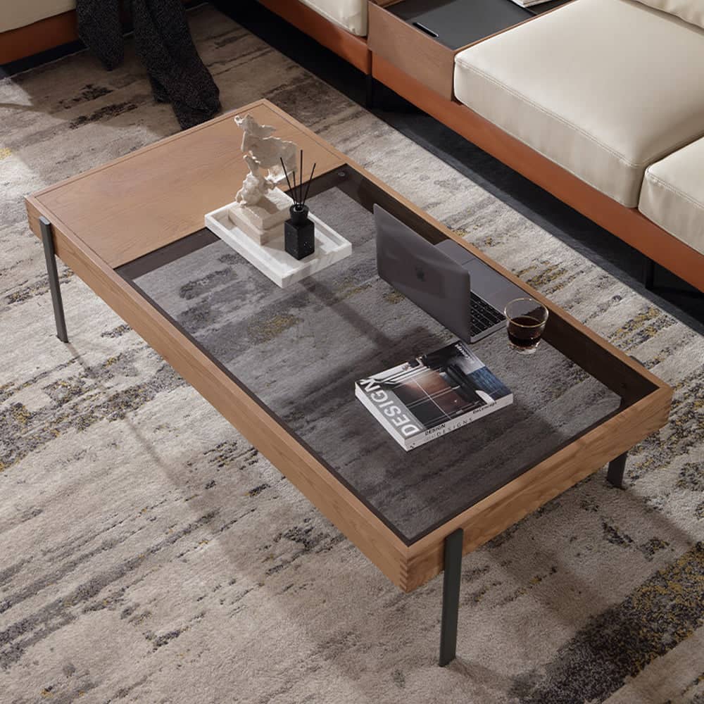 This luxurious, contemporary coffee table features a solid wood and glass top and sturdy metal legs with a polished finish. Durable and easy to clean, it adds a touch of sophistication to your living room.