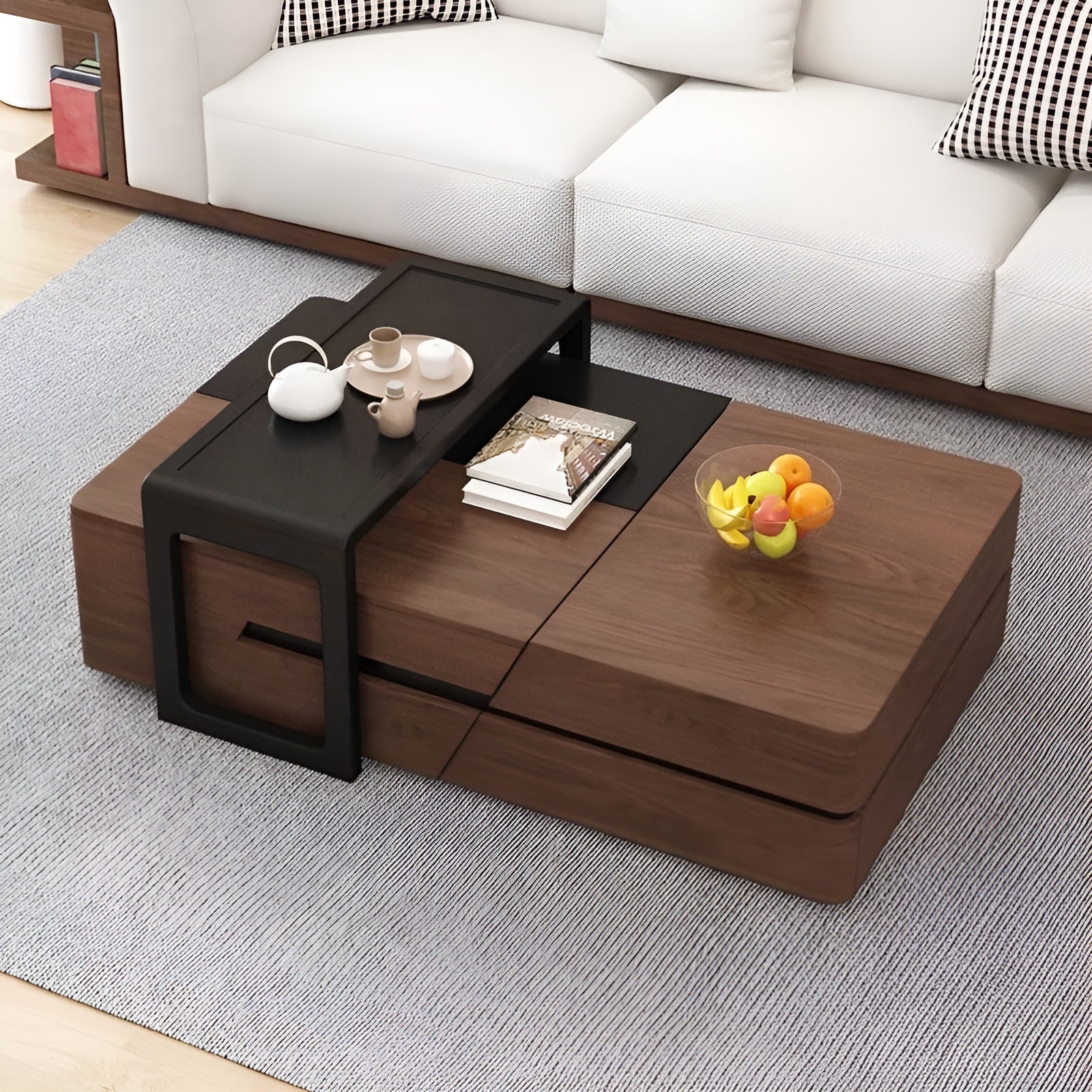 An innovative coffee table featuring high-quality materials and a modern, practical design, such as natural wood and metal, enhancing durability and sustainability. The table measures 130 cm wide, 77 cm deep, and 38 cm high. It can be used as a coffee table in the living room or elsewhere, and can be extended if more space is needed. This table is a great choice for those looking for a practical and modern coffee table.