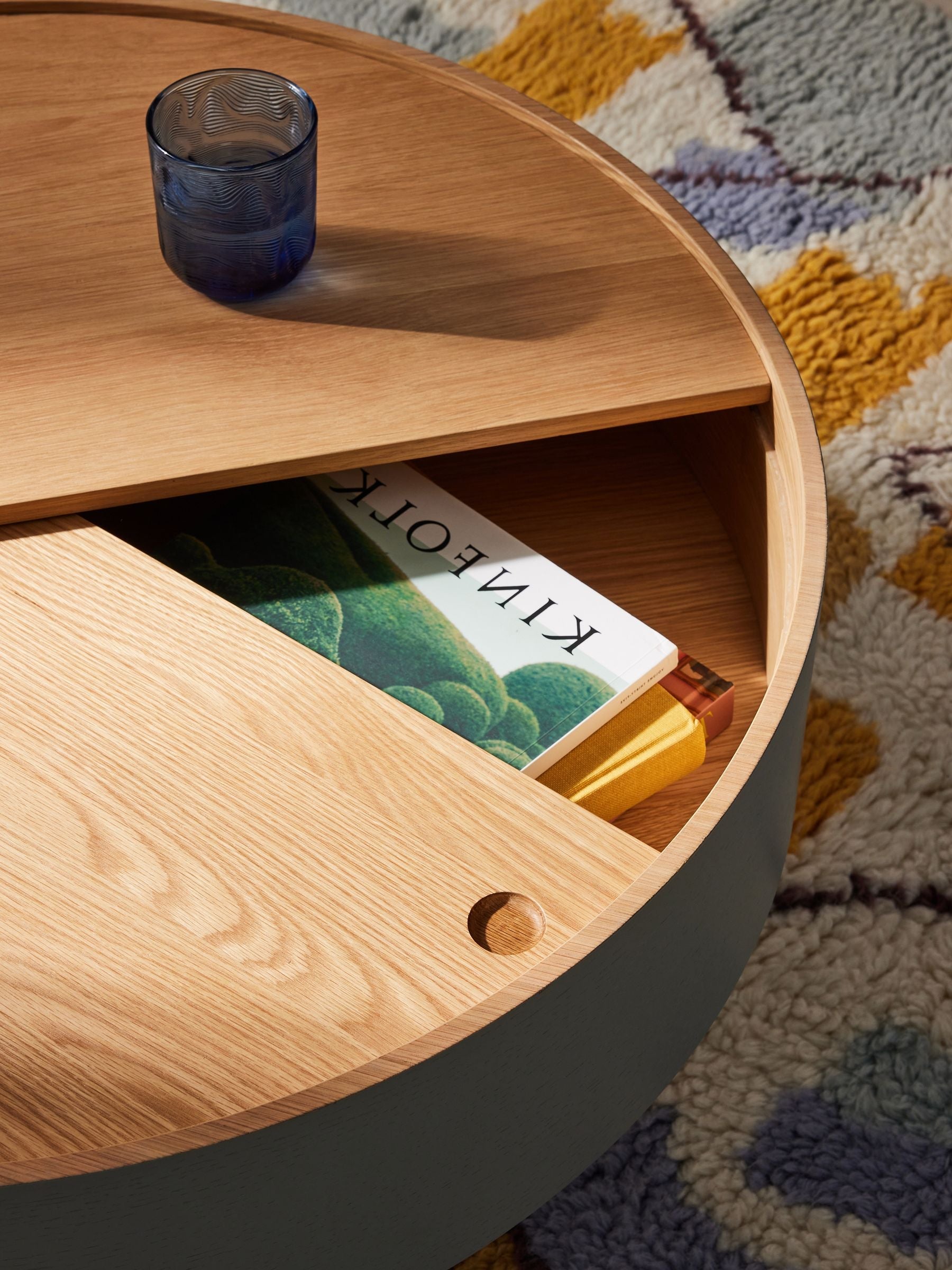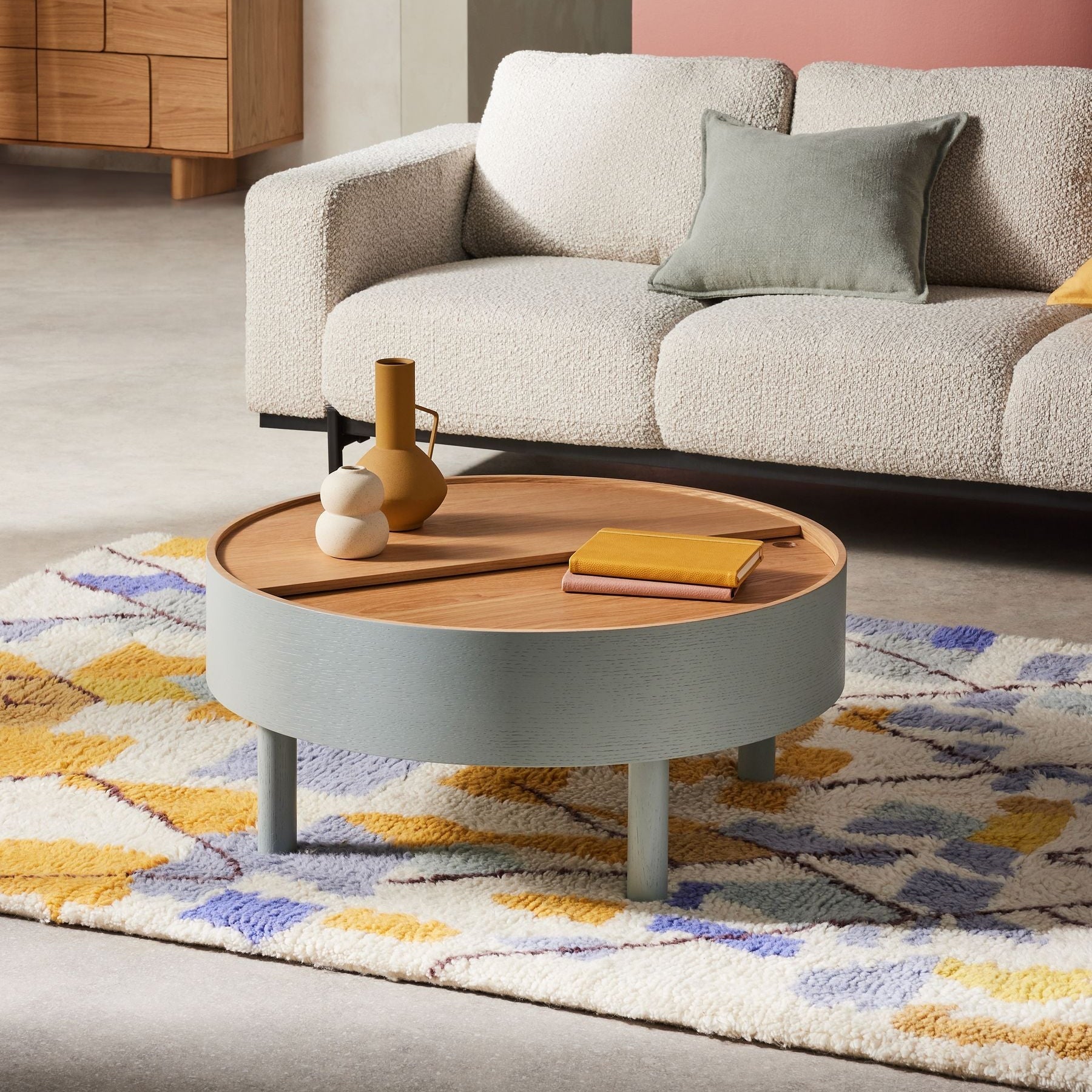 A coffee table with a modern and elegant design, featuring a round shape and a natural wood top that adds a warm touch to the decor. The table's base is made of wood stained in a soothing gray color, making it easily compatible with a variety of furniture styles.