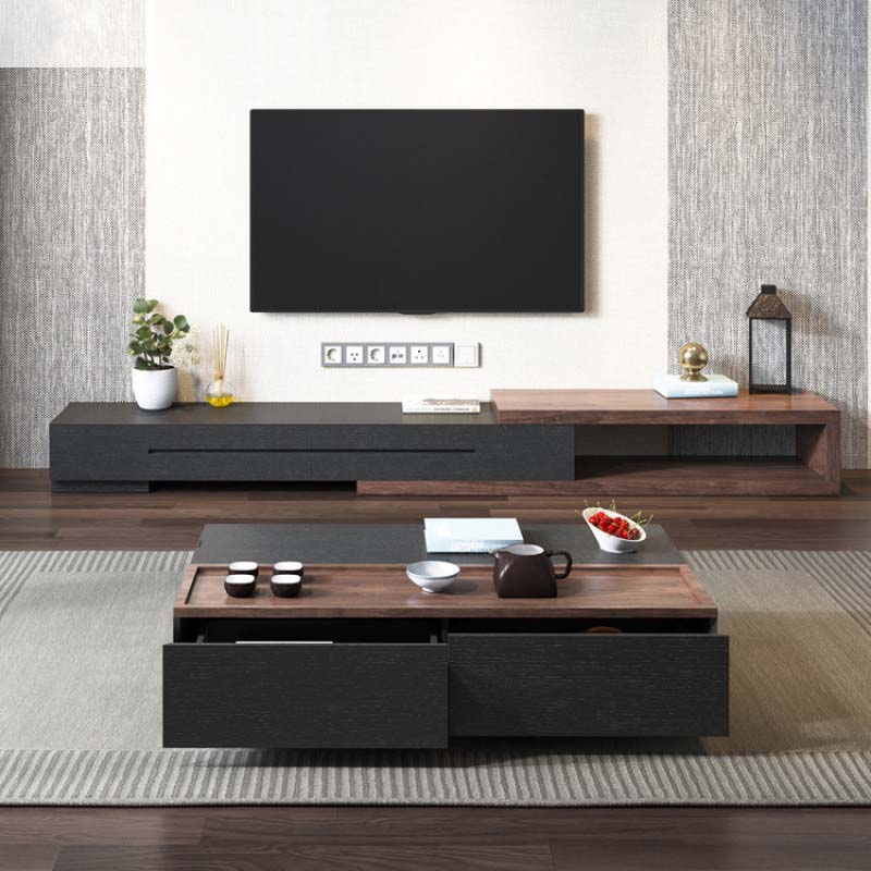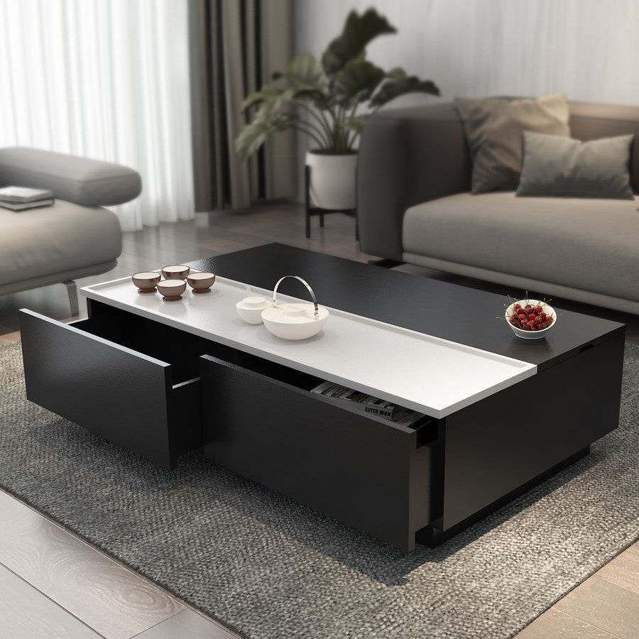 This modern coffee table combines elegance and functionality. It's crafted from high-quality wood in a sleek black finish that complements brown or white accents to suit a variety of decor styles. It features a smart design with drawers and multiple storage compartments that open and close smoothly, helping you organize your space with ease. Ideal for living rooms, it measures 120 cm wide, 70 cm deep, and 40 cm high.