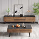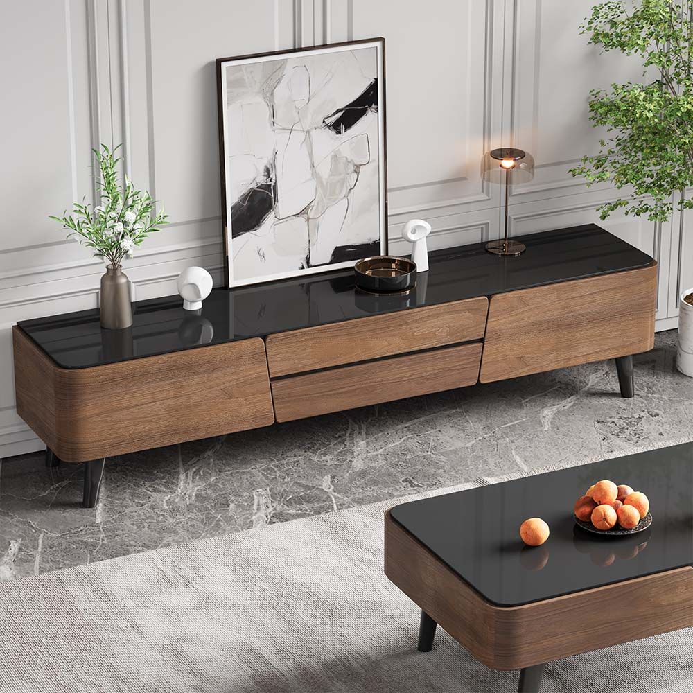 ارتقِ بتصميم غرفة معيشتك مع هذا الطقم المتناغم الذي يجمع بين الفخامة العصرية والخشبي الطبيعي. يتميز الطقم بخطوط منحنية ناعمة وتوليفة مذهلة من الألوان والمواد مع الأسطح العلوية من الزجاج الداكن أو اللامع. تتميز طاولة القهوة المركزية بتصميم مستطيل ذي حواف مدوّرة، مما يضفي عليها أناقة ناعمة.، كما تحتوي على جزء علوي ذكي قد يوفر مساحة تخزين خفية أو آلية رفع. ترتكز الطاولة على أرجل مدببة باللون الداكن، تعكس أناقة منتصف القرن الحديثة. تكمل طاولة التلفاز الطاولة المركزية، حيث تشترك معها في الأرجل المدببة والمنحنيات الناعمة للواجهة الخشبية.، وتوفر مساحة تخزين واسعة ومحكمة من خلال هذا الطقم هو الخيار الأمثل لمن يبحث عن تصميم متكامل، يجمع بين الدفء، والرقي، والوظيفة العملية، مما يجعله إضافة لا غنى عنها لأي منزل عصري فاخر." والأبواب الخشبية، مما يحافظ على ترتيب الغرفة.