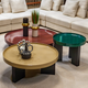 The table set pictured embodies a modern and elegant design that adds a unique touch to home decor. The set consists of three tables of different sizes, making them suitable for large, medium, and small spaces. Featuring a circular design, each table comes in a different color (red, green, and beige) to suit modern decor and make it an eye-catching piece that adds life and elegance to any space. The practical and contemporary design complements modern decor.