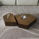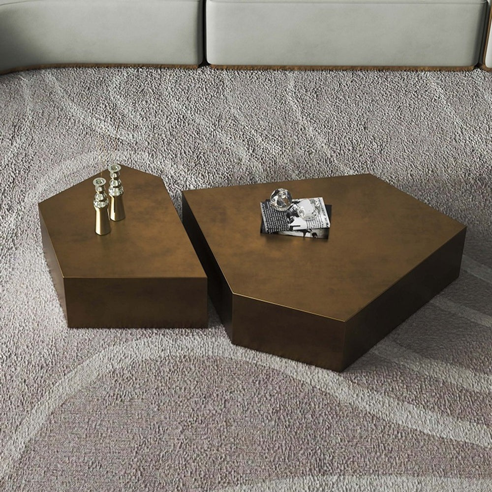 أضف لمسة من الفخامة المعدنية والتصميم الهندسي الجريء إلى قلب مساحتك مع طقم الطاولات المركزية هذا. يتميز الطقم بتصميم نحتي فريد على شكل مضلعات غير منتظمة، مما يجعله قطعة فنية بصرية آسرة بدلاً من مجرد طاولة. السطح مصقول بلمسة نهائية نحاسية أو برونزية مطفأة، تضفي عمقاً  وإحساساً بالفخامة الصناعية الراقية. يتكون الطقم من طاولتين بارتفاعين مختلفين وشكلين متكاملين، يمكن تنسيقهما متجاورتين لإطلالة متكاملة ، أو فصلهما للحصول على وظائف متعددة. هذا الطقم هو الخيار الأمثل لعشاق التصاميم الحديثة الذين يبحثون عن إضافة جريئة وثقيلة الوزن تلفت الأنظار وتعكس ذوقاً فنياً رفيعاً