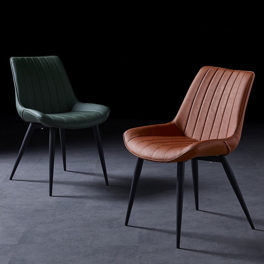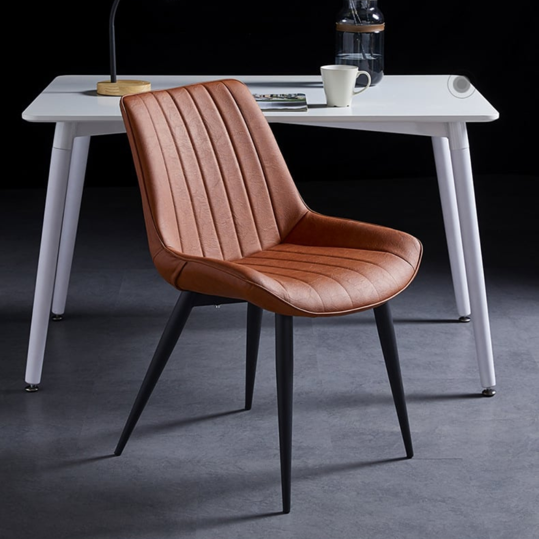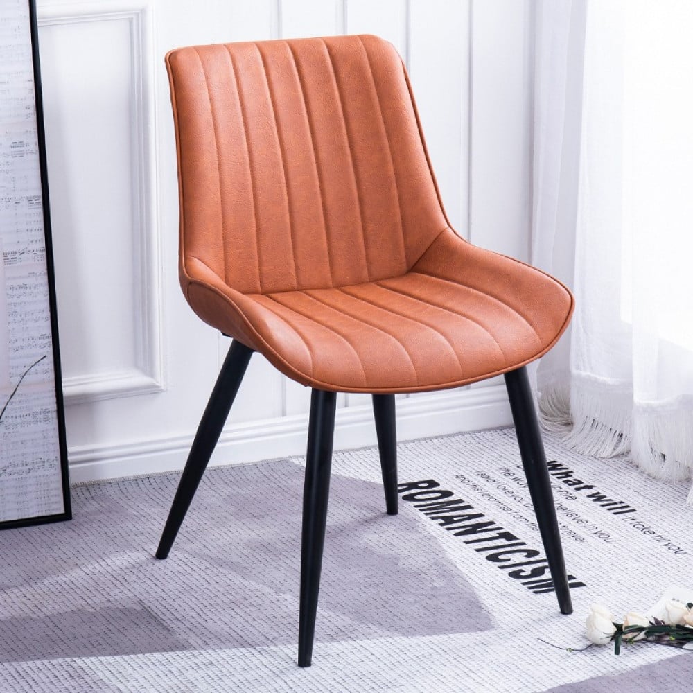 A stylish, modern chair with a distinctive design, crafted from high-quality materials. It features a comfortable seat covered in luxurious orange leather, with sturdy black metal legs for stability and strength. Its streamlined design makes it ideal for offices, dining rooms, or reading nooks. It adds a sophisticated touch to any space with a touch of luxury and comfort.
