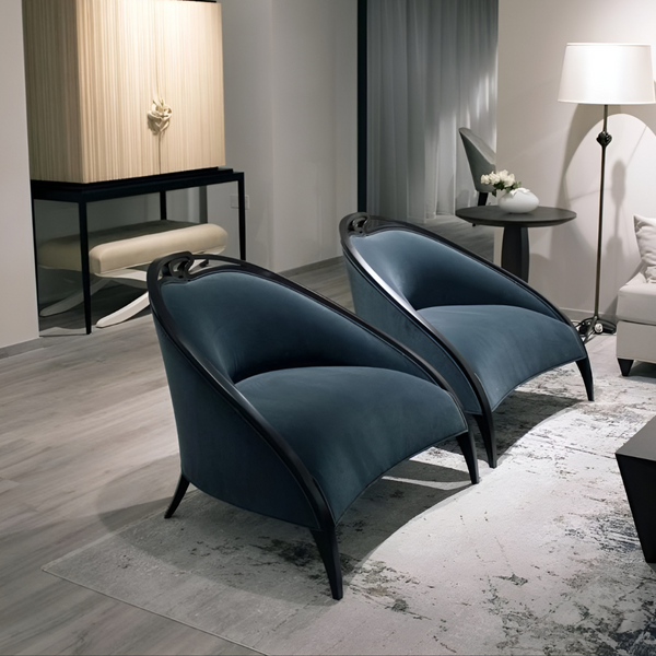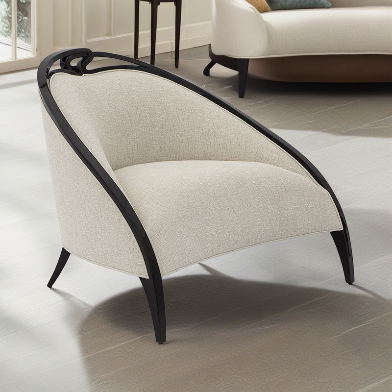 This elegant chair boasts a modern, luxurious design that combines comfort and beauty. It features a sturdy, glossy black frame with a curved frame that adds a sophisticated touch. The comfortable, spacious seat is upholstered in high-quality, light beige fabric, making it suitable for a variety of decor styles. The unique design of this chair makes it ideal for living rooms, lounges, or upscale offices, offering unparalleled comfort and elegance.