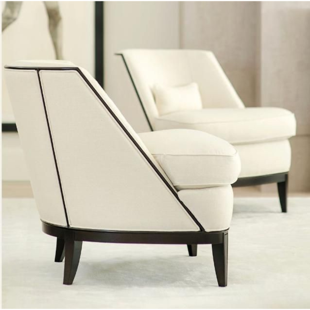 This luxurious chair features an elegant design that blends modern and classic style. It's crafted from luxurious fabric in a soft beige color, with a wooden frame for a sophisticated touch. Featuring a comfortable padded seat and sloping backrest, it's the perfect addition to any space, whether in a living room or a luxurious corner.