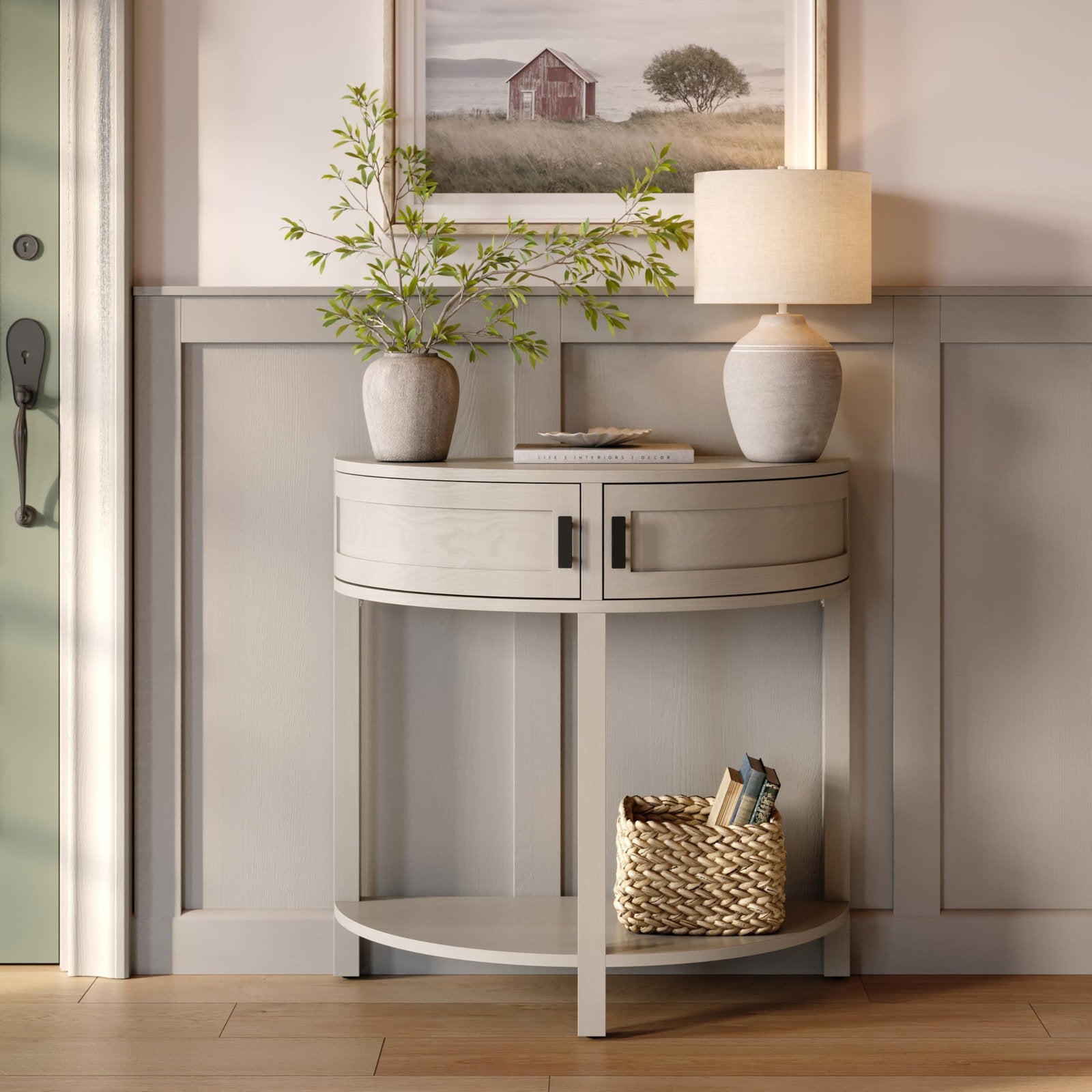 The Royal Eloria console table, crafted from natural wood, adds a warm touch to any space. It features two drawers with black handles for storing small items, plus a lower shelf for organizing or storing decorative items. Its classic, modern design complements a variety of decor styles, making it ideal for entryways or living rooms.