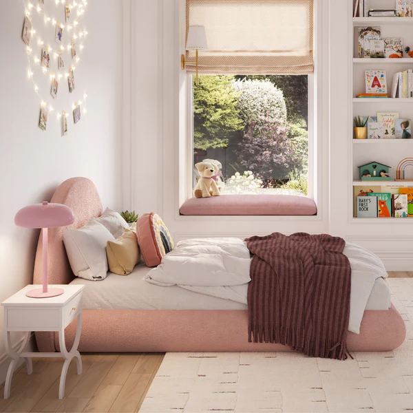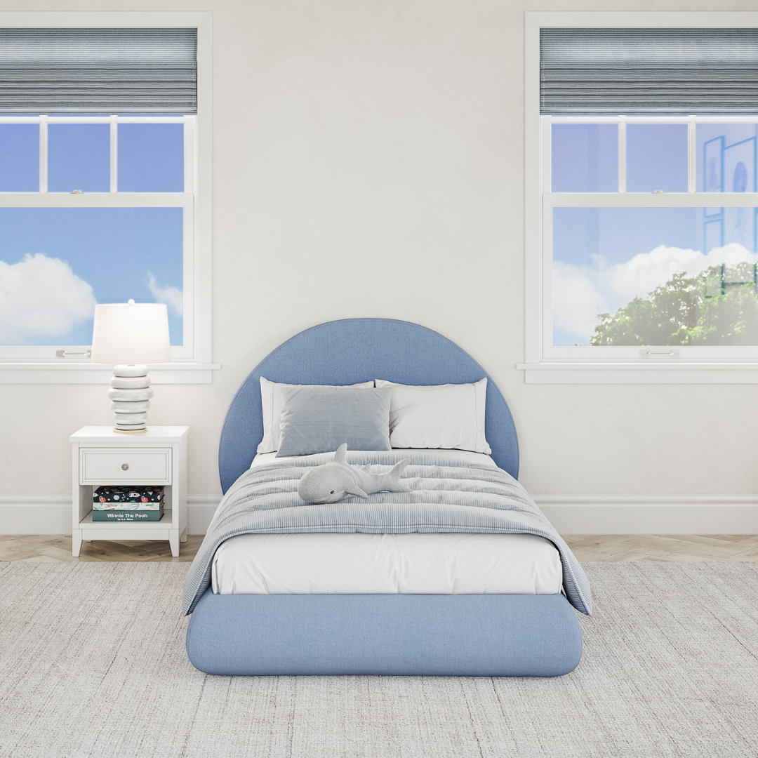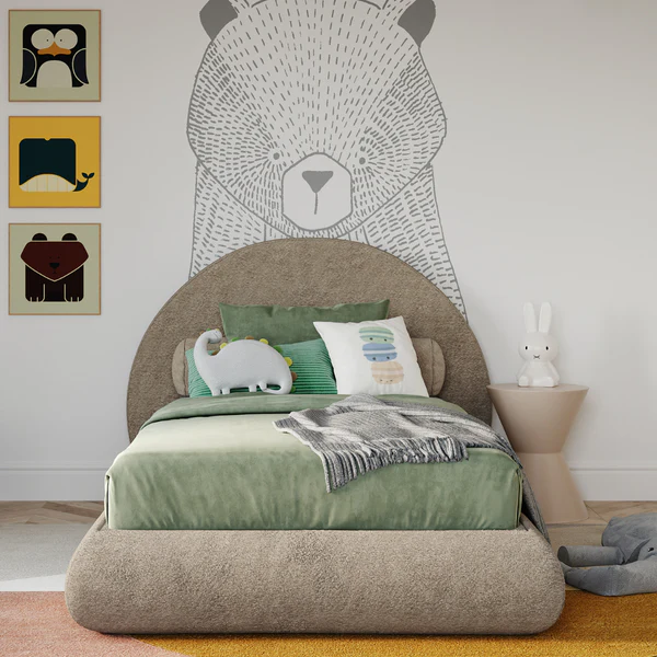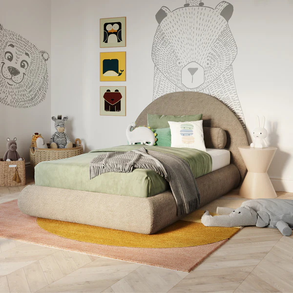 السرير يتميز بتصميم بسيط وهادئ، يجمع بين الأناقة والبسيط سيكمل أي ديكور. يتمحور التصميم حول رأس سرير مرتفع يأخذ شكلاً نصف دائريًا، مما يضفي لمسة من النعومة والتوازن على التصميم العام. هذا الشكل المميز يضيف إلى الراحة العامة ويضمن السلامة، مما يجعله نقطة محورية جذابة في الغرفة.