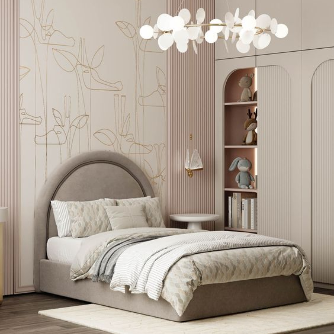 سرير بتصميم مودرن يتميز بمسند الرأس بإطار مدور باللون الرمادي المحبب، تحافظ على المظهر الفخم لظهر السرير الفخم المصنوع خصيصاً للقراءة الليلية أو للاسترخاء في الصباح الباكر. يعد السرير الخشبي المنجد من يضفي عليها مظهرًا فريدًا تشكيلة منتجاً .