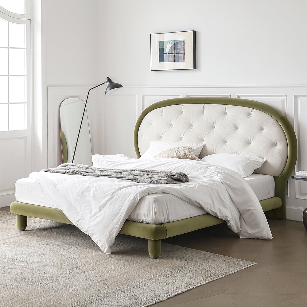 هذا السرير الفاخر يجمع بين التصميم العصري والأناقة، مع إطار خشبي متين مغطى بقماش فاخر ناعم باللون الأبيض مع تفاصيل خضراء تمنح شعورًا بالهدوء والجاذبية. اللوح الأمامي المبطّن يضفي لمسة راقية مع تصميم مستدير يعزز من الراحة والجمال. إضافة مثالية لأي غرفة نوم تبحث عن التميز والراحة في آنٍ واحد.