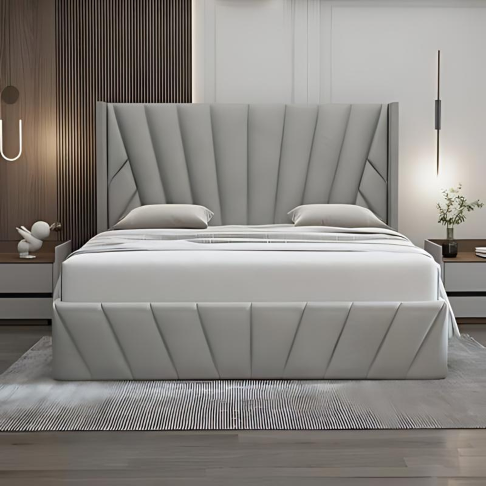 سرير أنيق بتنجيد فاخر من قماش المخمل الناعم، متوفر بلون البيج والرمادي الراقي ليمنح غرفتك لمسة من الدفء والرقي. يتميز بتصميم عصري يدمج بين البساطة والفخامة، مع خامات عالية الجودة توفر لك أقصى درجات الراحة والاسترخاء. ، سيضفي هذا السرير طابعًا مميزًا على ديكور غرفة نومك.