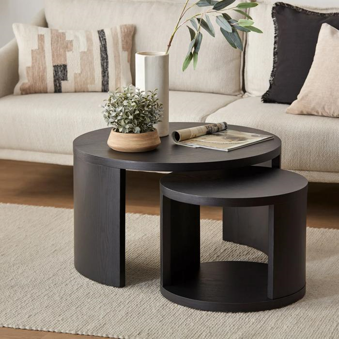 تقدم طاولات القهوة من الخشب الطبيعي عالي الجودة بلون الأسود الأنيق تتكون من قطعتين متداخلين تصميمًا بسيطًا وأنيقًا يعزز جمالية أي مساحة داخل منزلك. الطاولة الكبيرة بتصميم عصري وجذاب بداخلها طاولة أصغر يمكن أستخدامها بشكل متصل، ما يضيف مرونة وعملية للمساحة ،تضيف لمسة طبيعية ودافئة على الديكور الداخلي للمنزل.