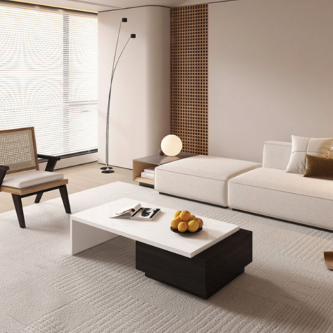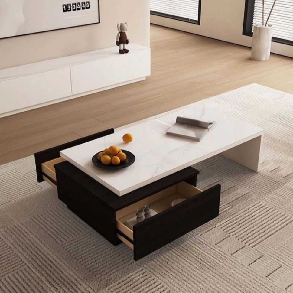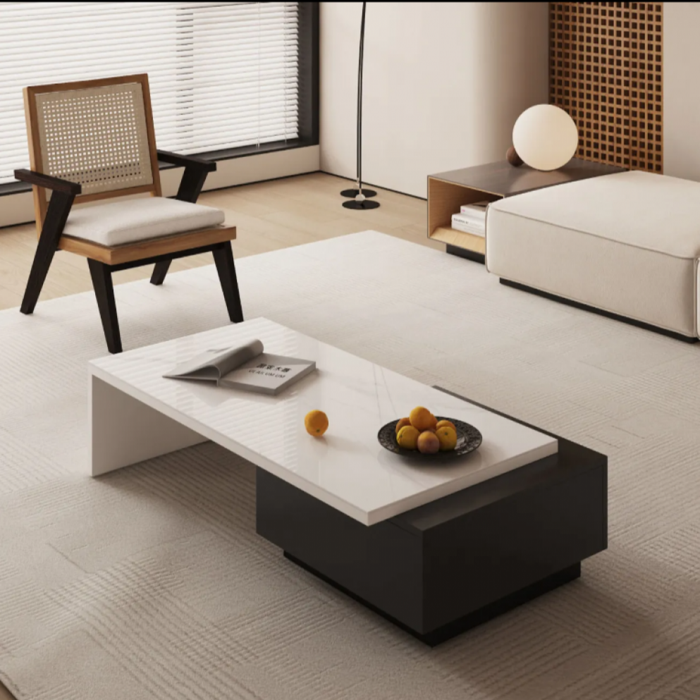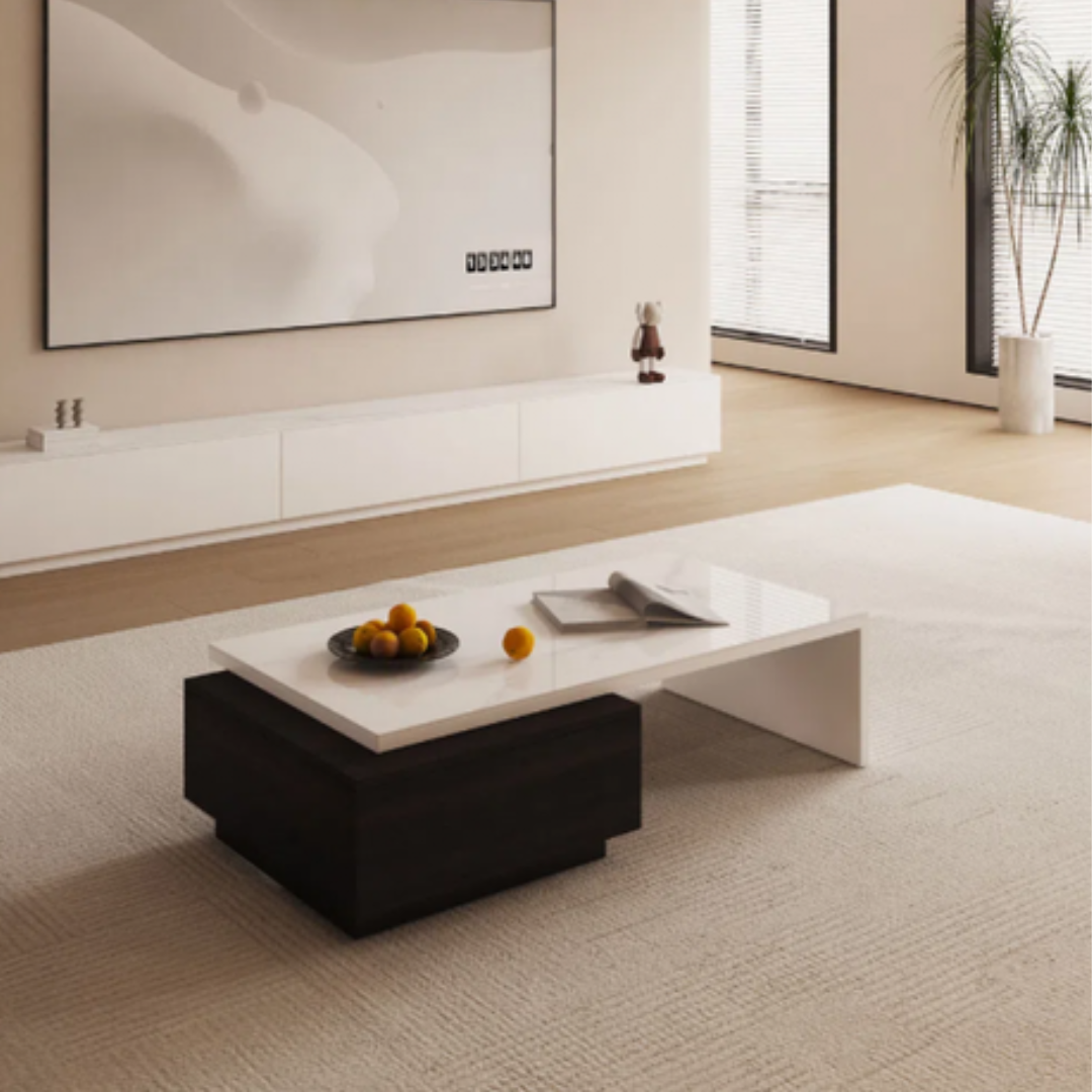 طاولة قهوة بتصميم عصري وفاخر، اجعل مساحتك أكثر أناقة مع هذه الطاولة التي تجمع بين اللون الأبيض واللون الأسود الداكن. تصميم مبتكر بمساحات تخزين عملية تساعدك في تنظيم أغراضك بسهولة مع لمسة جمالية تضيف الفخامة إلى ديكورك