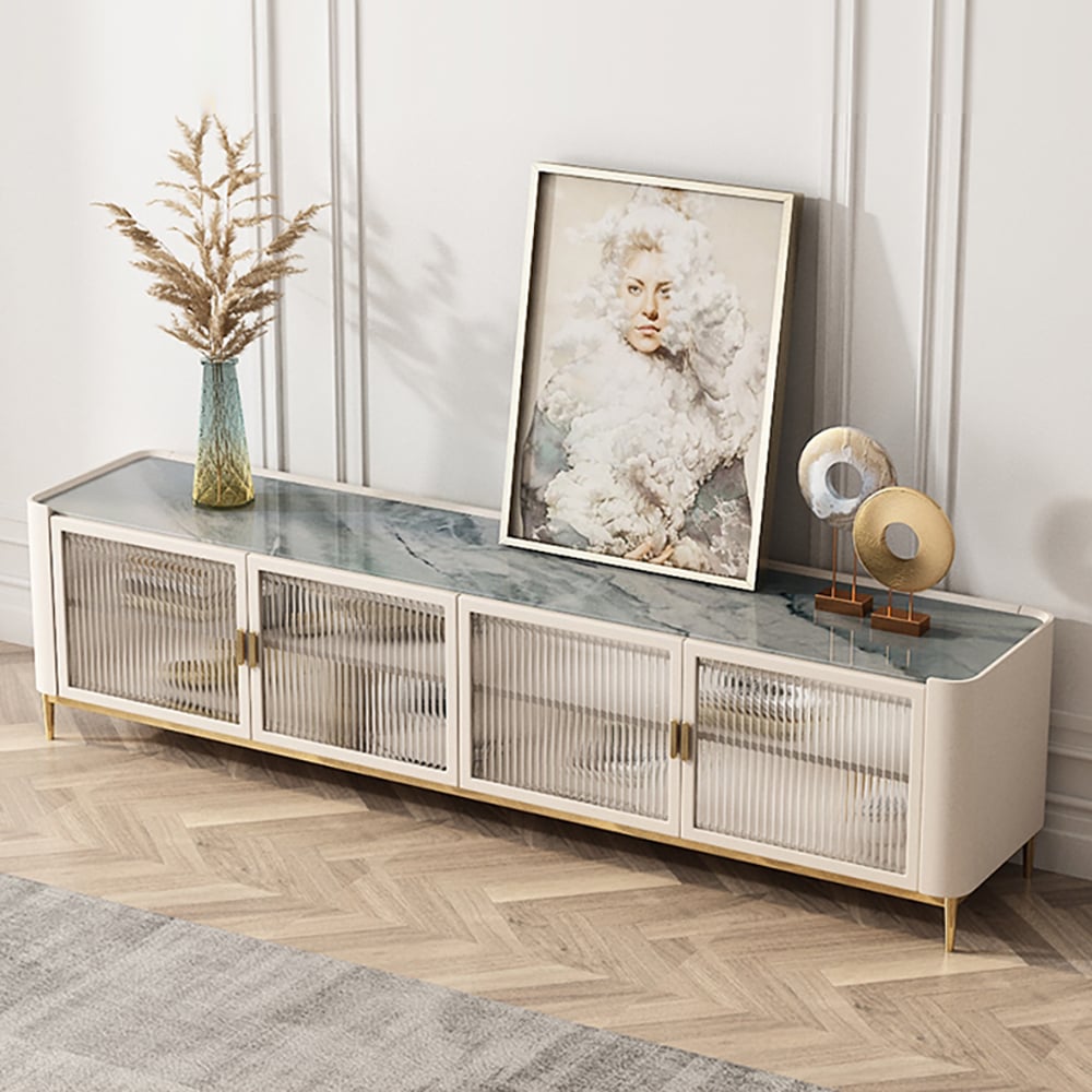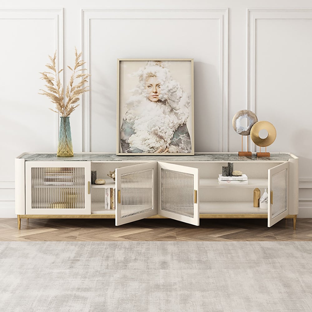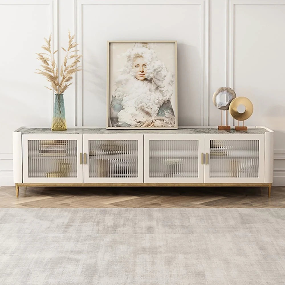 "ارفع مستوى فخامة صالتك مع طاولة التلفاز هذه التي تعد تحفة فنية بحد ذاتها. تصميمها الراقي يمزج بين الأسلوب العصري الفاخر واللمسات الكلاسيكية السطح العلوي يتميز بطبقة من بديل الرخام لإضافة لمسة متميزة . التخزين اربعة أبواب زجاجية مضلعة تُخفي الأجهزة وتسمح بعرضها بأناقة. التفاصيل أرجل نحيفة باللون الذهبي تزيد من أناقة القطعة ورقيها. إنها الخيار المثالي لمنزل يبحث عن التنظيم الفاخر والجمال المذهل في قطعة أثاث واحدة."