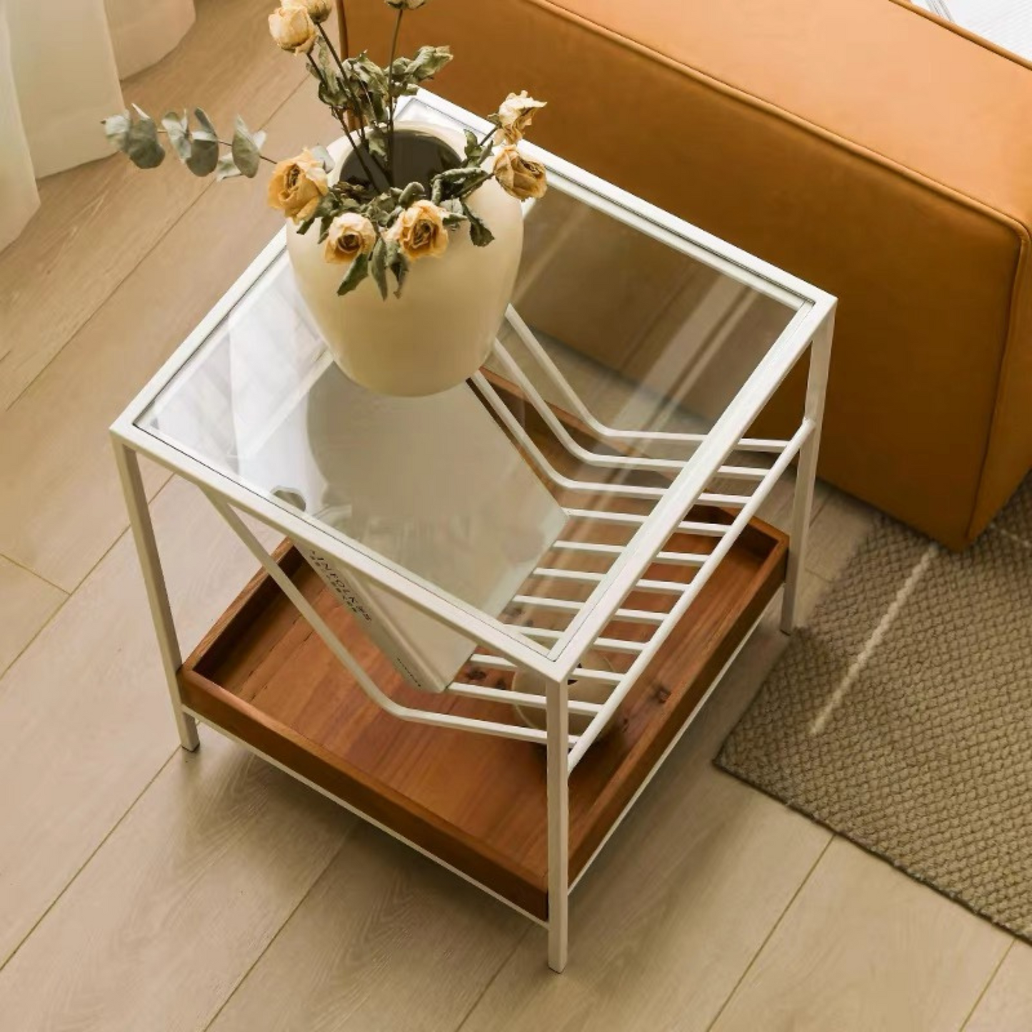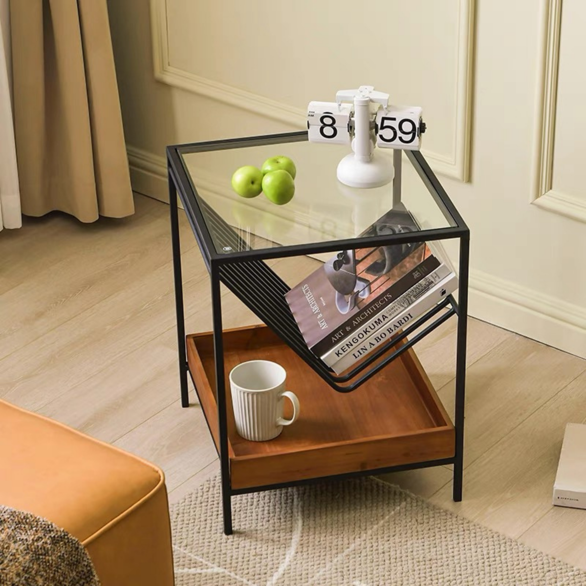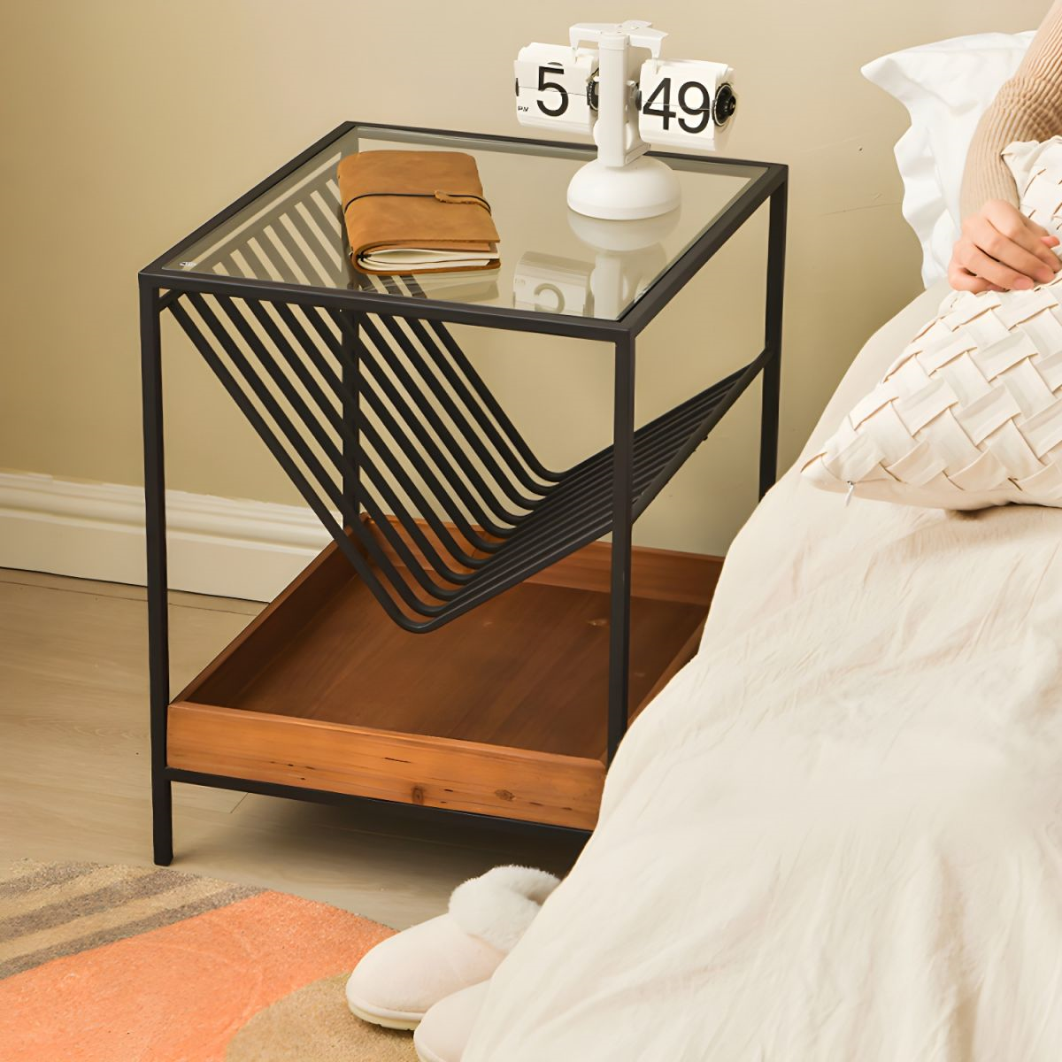 تتميز الطاولة بتصميم أنيق ومبتكر يجمع بين البساطة والوظيفة العملية، مما يجعلها إضافة مثالية لغرف النوم أو غرف المعيشة. تأتي الطاولة بهيكل مصنوع من المعدن الأسود المتين مع سطح علوي شفاف من الزجاج، ما يضفي مظهرًا عصريًا وجذابًا. يضم التصميم أيضًا رف معدني مائل على شكل شبكة أنيقة، مثالي لتخزين المجلات أو الصحف بطريقة منظمة وعصرية. كما تحتوي الطاولة على قاعدة خشبية متينة تضيف لمسة دافئة للتصميم وتوفر مساحة إضافية لوضع الأغراض المختلفة مثل الكتب أو الصناديق الصغيرة.