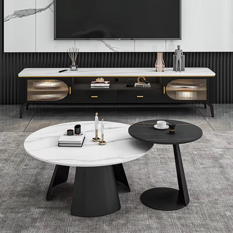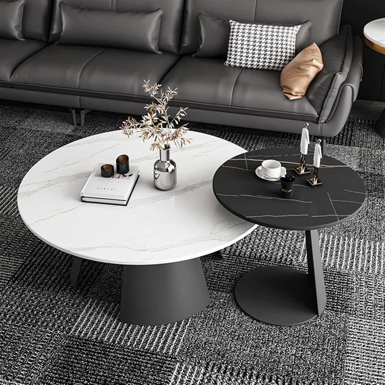 طاولتين بتصميم مودرن , مصممه بشكل يلفت انظار الجميع منسقة باللون الأبيض و هيكل باللون الأسود بشكل هرمي يعطي مظهراً جمالياً مختلف بمقاس ( القطر 90 سم - الارتفاع 40 سم ) بقاعدة  عالي الجودة , بطاولة اخري بمقاس اصغر بنفس التصميم بلون اسود بالكامل بمقاس ( القطر 50 سم - الارتفاع 50 سم ) لتضيف لمسة مختلفة لمنزلك.