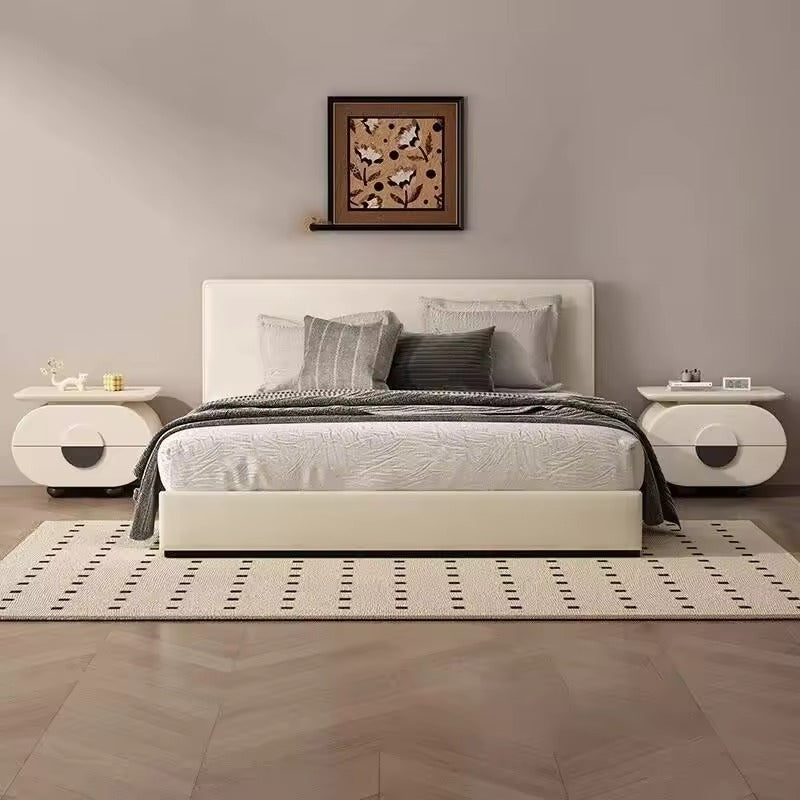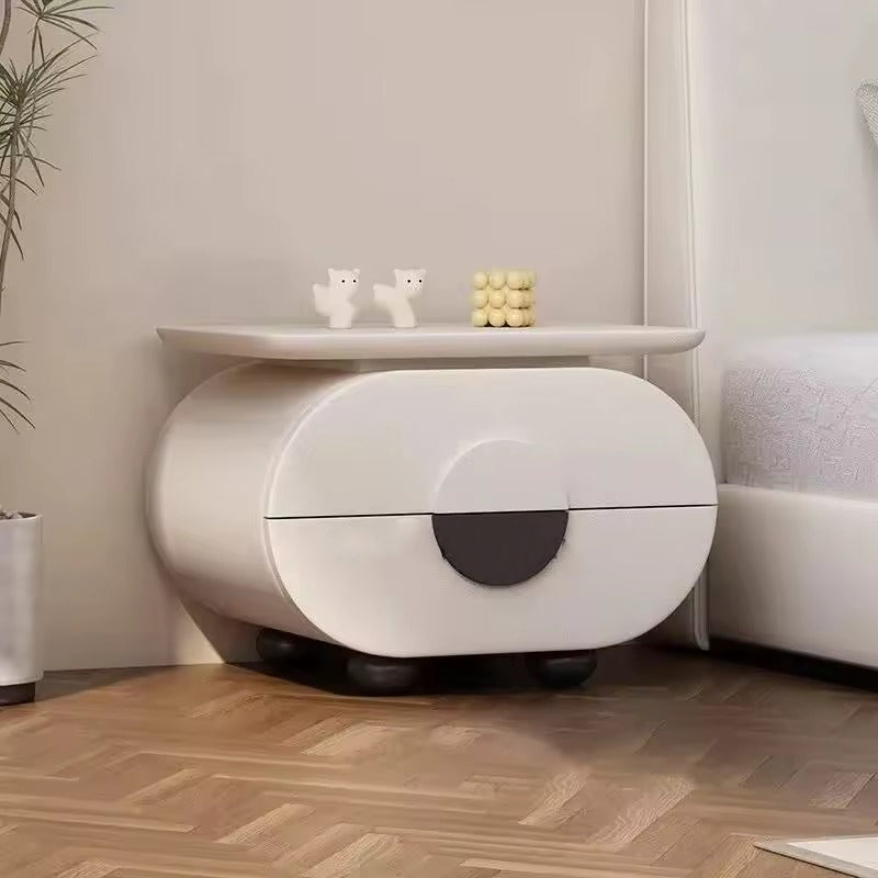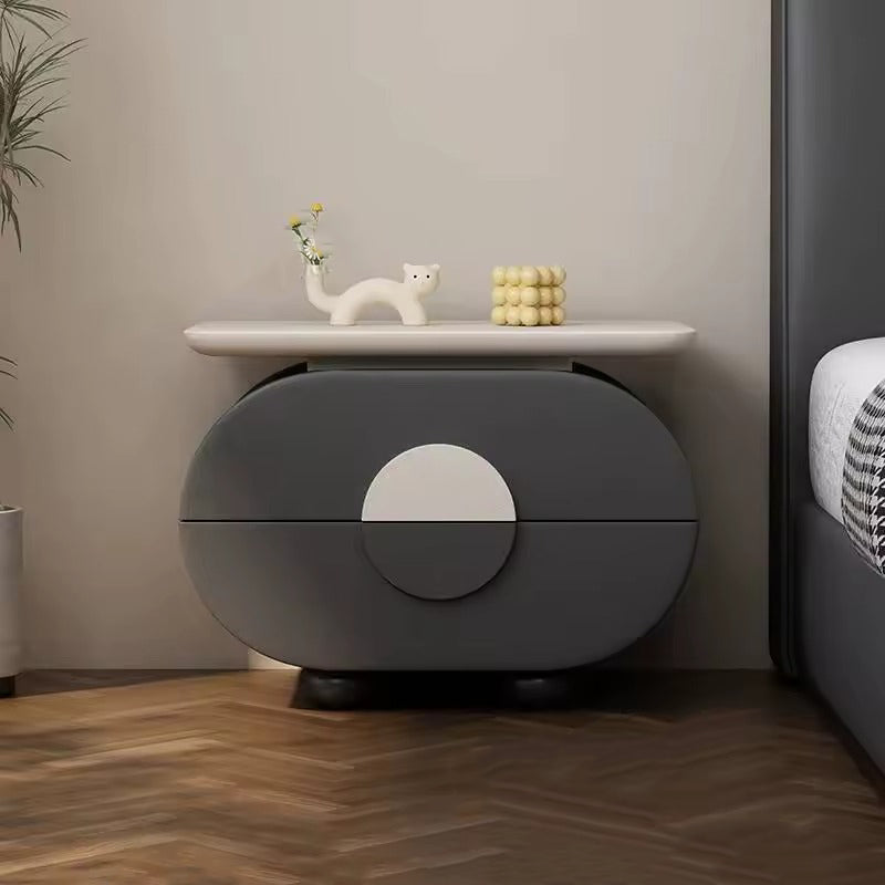 هل تبحث عن قطعة أثاث جانبي تكسر الملل وتضفي لمسة من الإبداع الفني على غرفة نومك؟ هذه الكومودينة ليست مجرد مكان لتخزين الأشياء، بل هي بيان تصميمي جريء يجمع بين الفن المعاصر والوظيفة الذكية. تتميز بتصميمها المنحني والبيضاوي الذي يبتعد عن الخطوط التقليدية. هذا الشكل العضوي يمنح الغرفة نعومة وحيوية بصرية. تتوسط واجهة الأدراج دائرة خشبية مركزية، وهي ليست مجرد عنصر جمالي، بل هي أيضًا مقبض خفي ومميز للأدراج، مما يعكس اهتماماً عالياً بالتفاصيل.