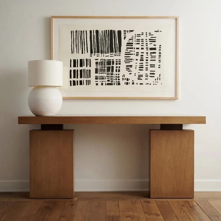 هذا الكونسول يتميز بتصميم عصري وأنيق يجمع بين البساطة والفخامة. مصنوع من الخشب بلون بني دافئ، ويتميز بسطح مستطيل ومدعوم بقاعدتين عريضتين على الجانبين، مما يمنحه ثباتًا وقوة. الكونسول يمكن استخدامه في المداخل، غرف المعيشة، أو حتى في المساحات التجارية لإضفاء لمسة راقية.