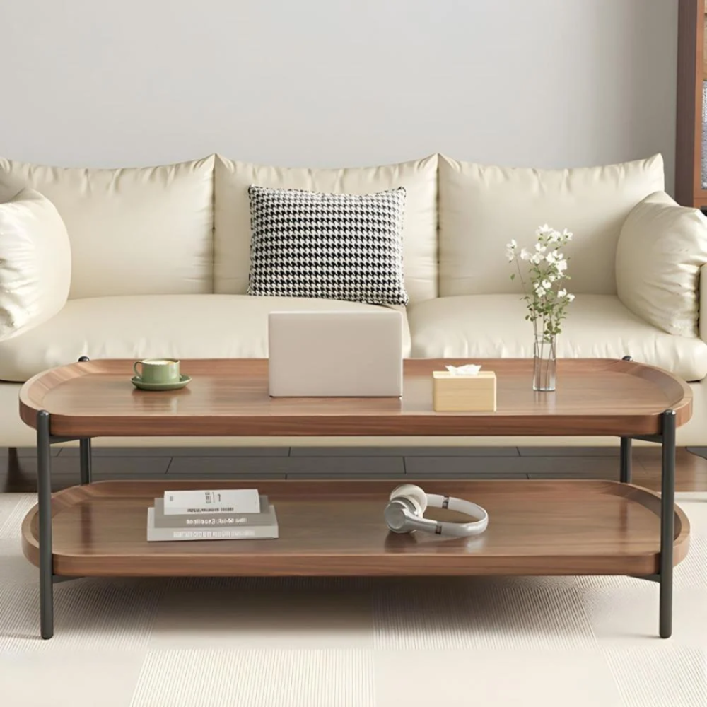 "طاولة قهوة عصرية مصنوعة من الخشب والمعدن، متوفرة بمجموعة متنوعة من الألوان لتناسب مختلف الأذواق وديكورات المنازل. تتميز بسطح خشبي أنيق ولمسات معدنية تضفي لمسة من الحدا