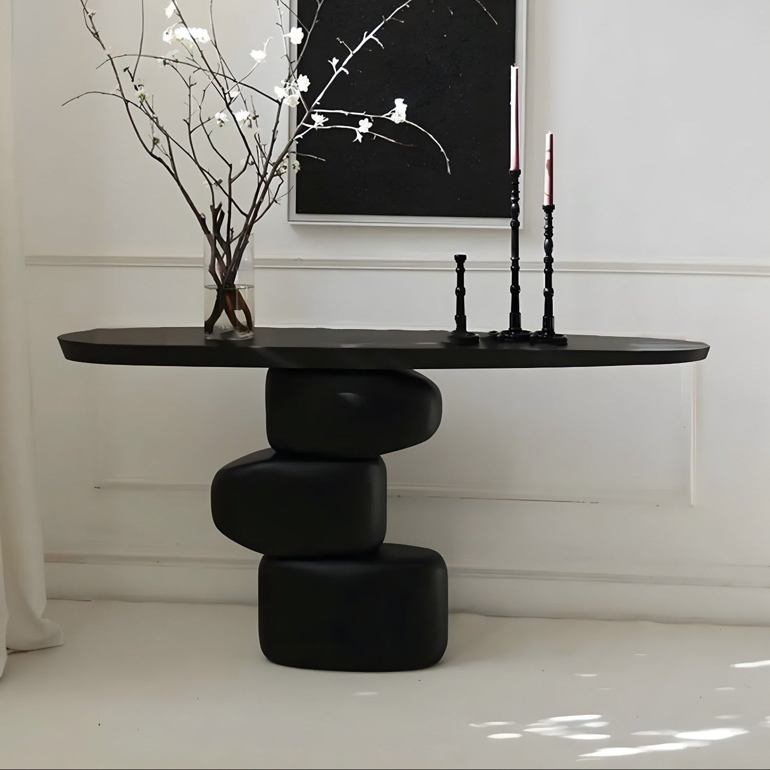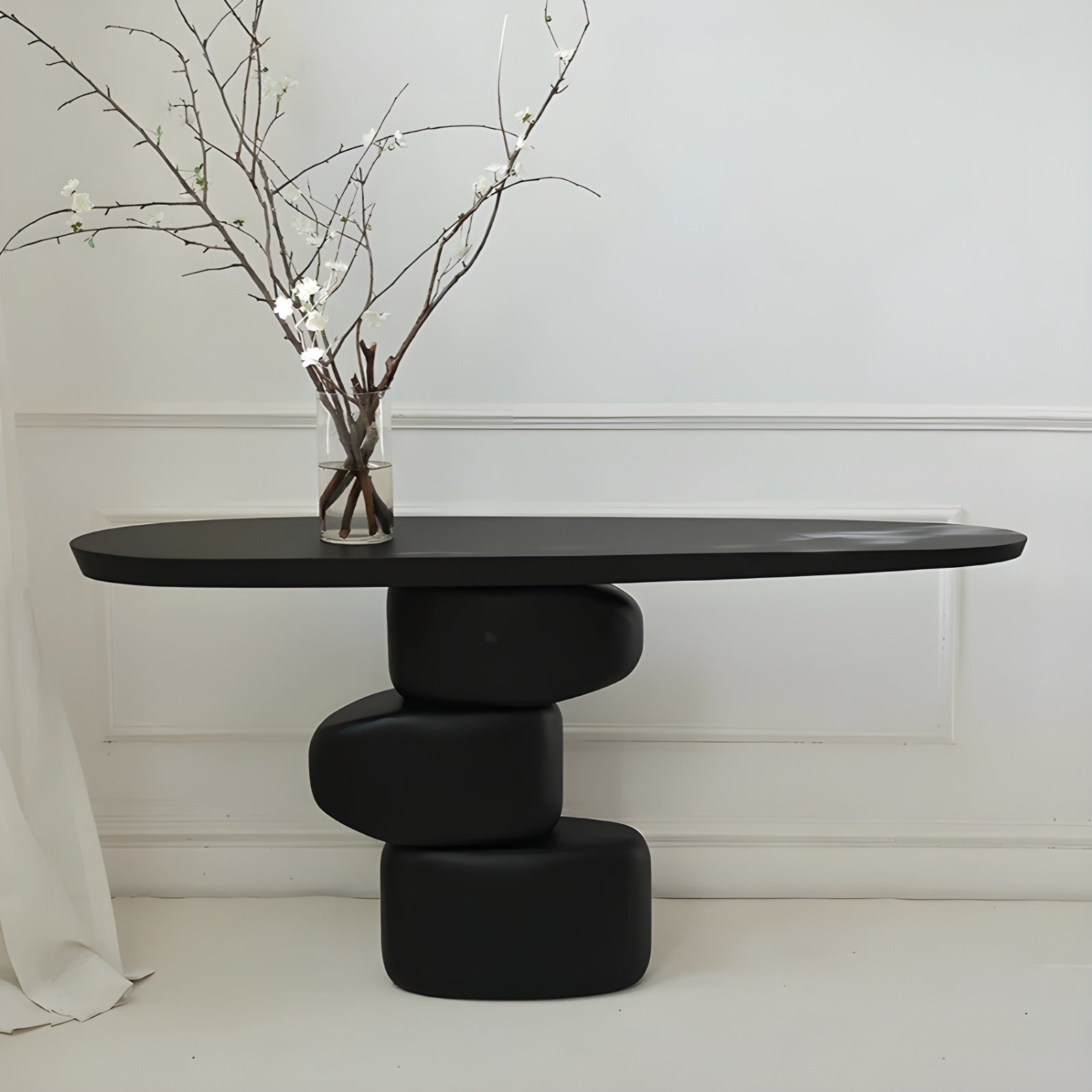 هذا الكونسول ليس مجرد طاولة، بل قطعة فنية تجمع بين الأناقة والبساطة. تصميمه الفريد بقاعدة من كتل مستديرة فوق بعضها يمنحه مظهرًا عصريًا وجريئًا. سطحه البيضاوي الأسود يضيف لمسة من الرقي، مما يجعله مثاليًا لأي مدخل أو ممر تبحث فيه عن الأناقة والتميز.